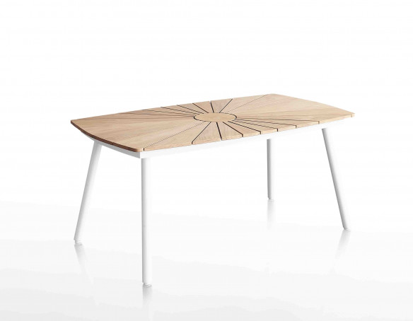 Elegant rektangulært havebord der kombinerer funktionalitet og stil. Med bordplade i flot kerne teaktræ og stel i pulverlakeret hvid aluminium.
