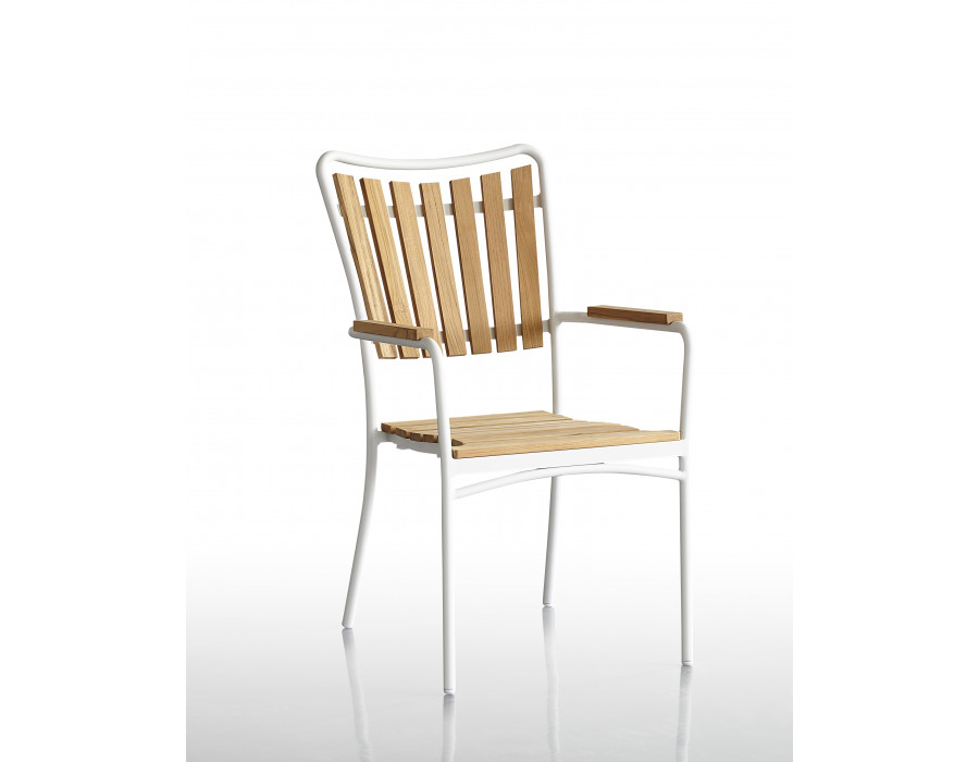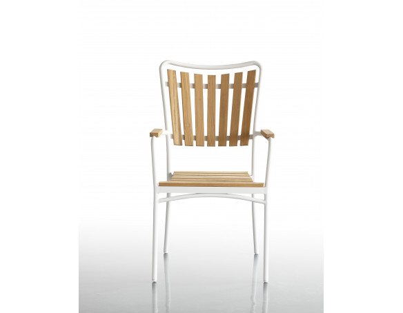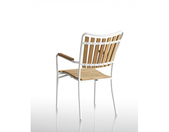 Denne stol har et elegant stel i pulverlakeret hvid aluminium og er designet med et ergonomisk sæde og ryg i certificeret kvalitets teaktræ.