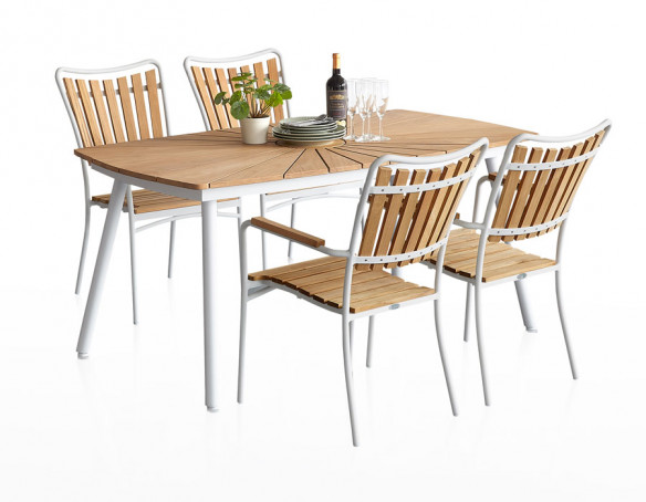 Superflot sæt med rektangulært havebord med bordplade i flot kerne teaktræ og stel i pulverlakeret hvid aluminium.