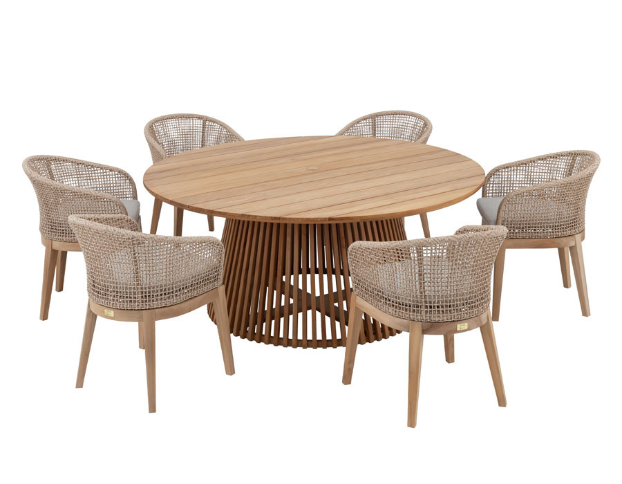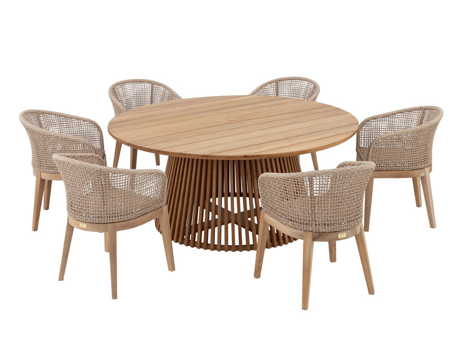 Skab en indbydende spiseplads under åben himmel med dette sæt, hvor Luna teakbordet matches med 4 Lago havestole. Bordet er fremstillet i kerneteak fra plantage i Indonesien og står på et konisk understel med lameller, som giver et let og elegant udtryk uden at gå på kompromis med stabiliteten. Den centrale base giver god benplads hele vejen rundt, og den...