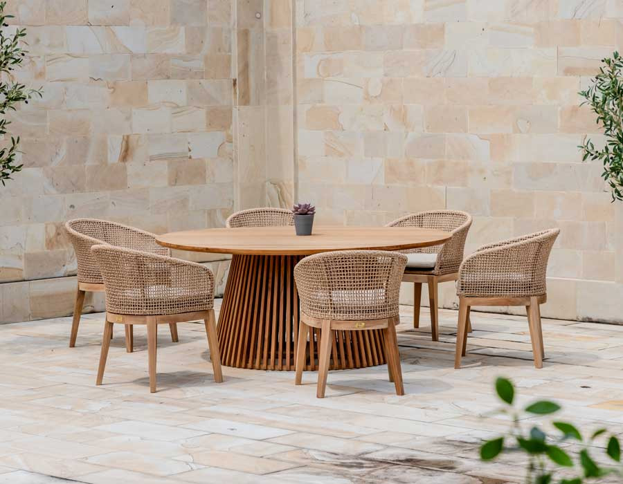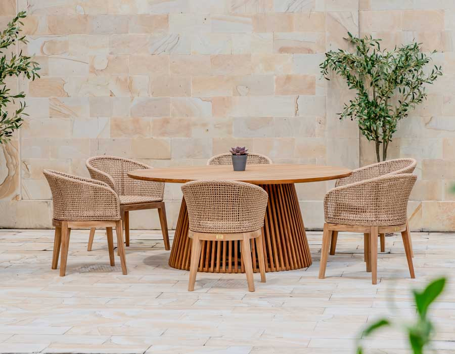 Skab en indbydende spiseplads i uderummet med Balder kerneteak havebordet og 4 Lago havestole i et harmonisk, naturligt udtryk. Bordet er udført i certificeret kerneteak og har et enkelt, tidløst design med bløde, afrundede hjørner, der giver et let og elegant look på terrassen.