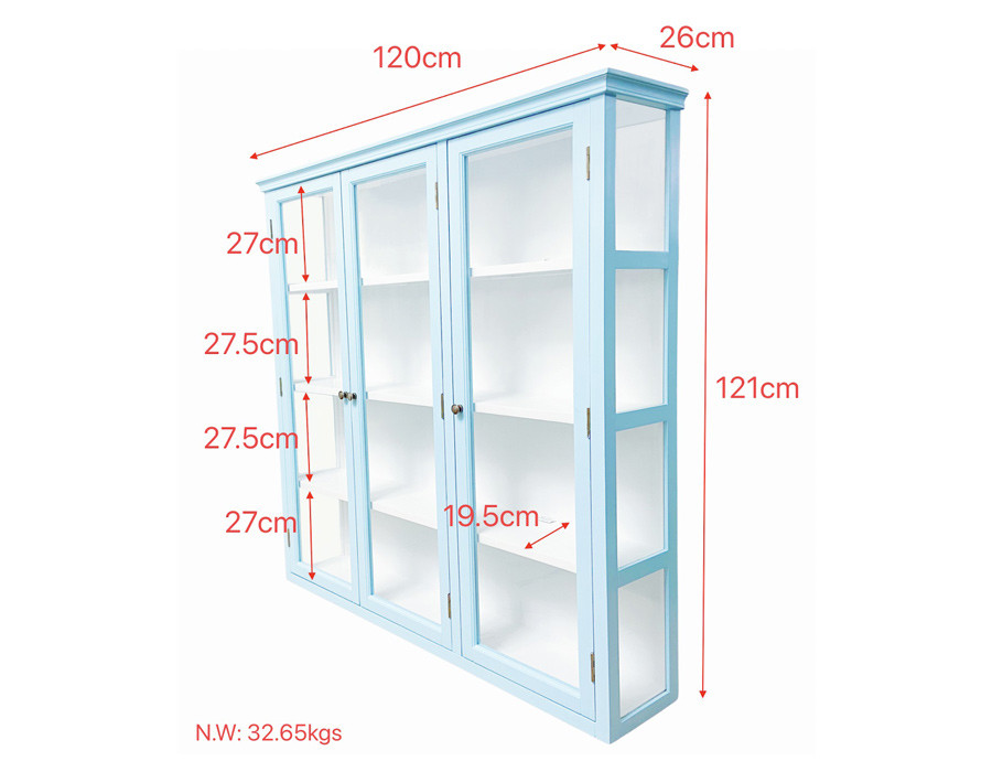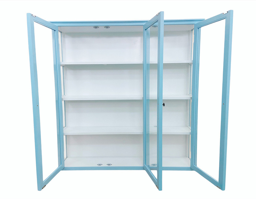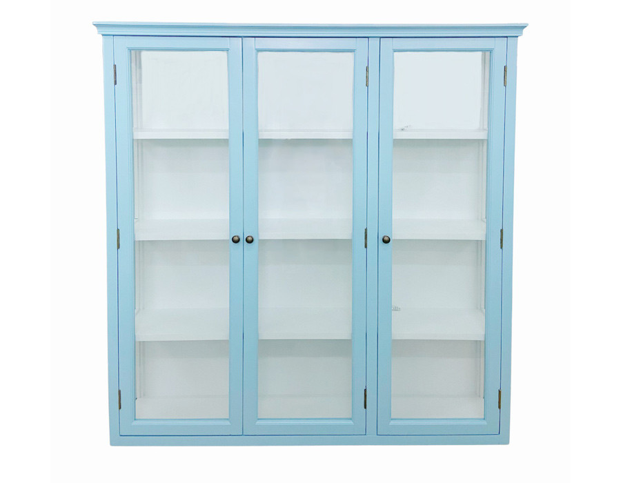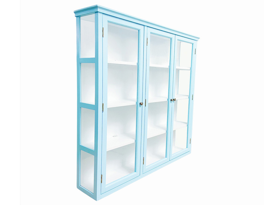 Skabet har tre glaslåger og glas på siderne, så dine udstillingsgenstande kan ses fra alle vinkler. Det er udstyret med tre hylder og kommer færdigsamlet.