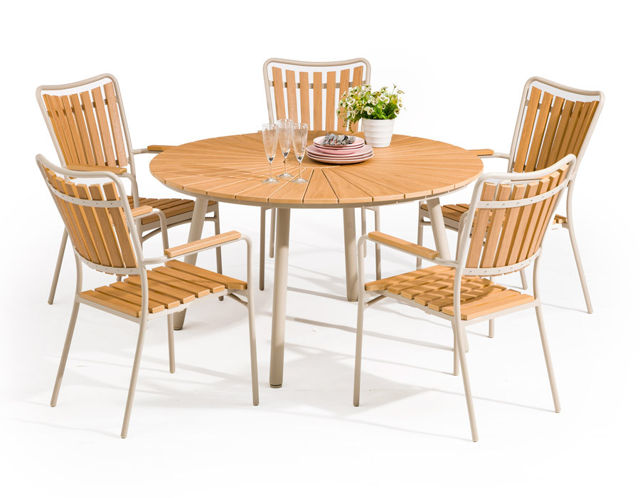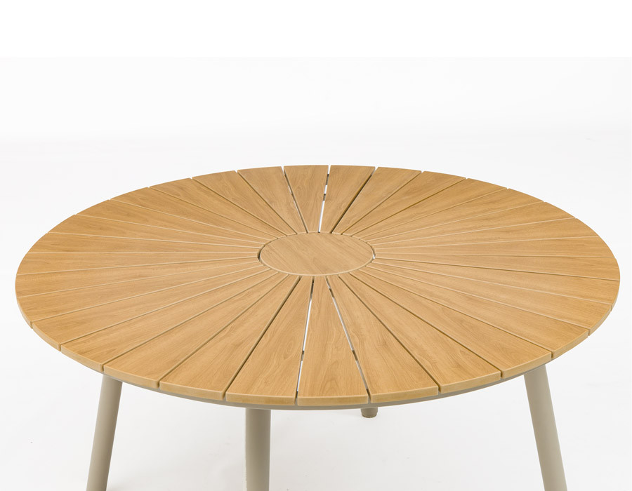 Giv uderummet et elegant løft med dette runde havebord. Bordpladen i nonwood har et flot, naturligt trælook og er skabt til at holde sig pæn med minimal vedligeholdelse. Det pulverlakerede aluminiumsstel i latte-farve giver et let, moderne udtryk, og med justerbare stilleskruer står bordet stabilt – også på ujævne underlag.