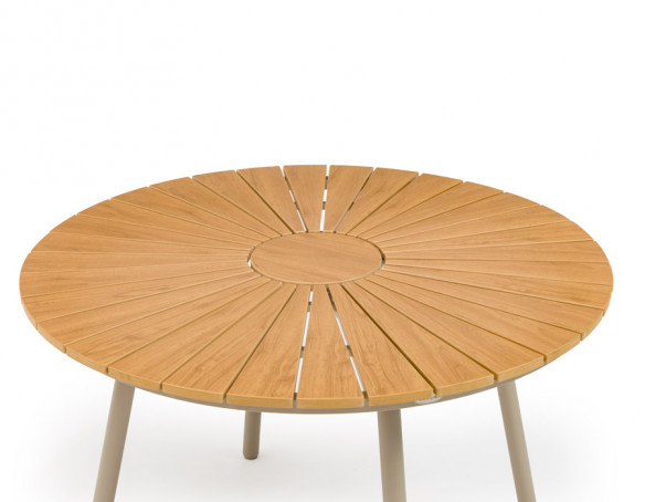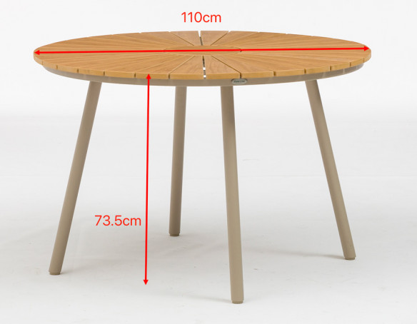 Giv uderummet et elegant løft med dette runde havebord. Bordpladen i nonwood har et flot, naturligt trælook og er skabt til at holde sig pæn med minimal vedligeholdelse. Det pulverlakerede aluminiumsstel i latte-farve giver et let, moderne udtryk, og med justerbare stilleskruer står bordet stabilt – også på ujævne underlag.