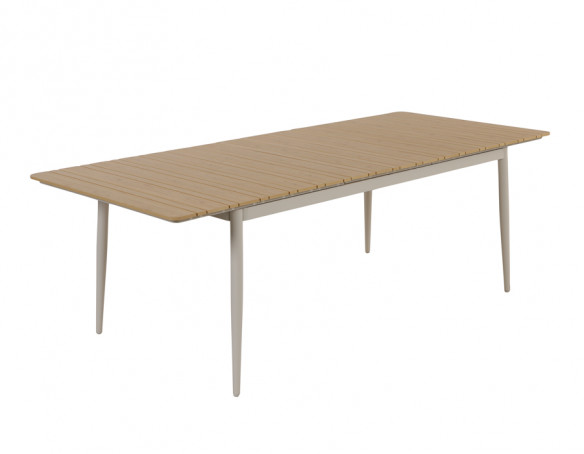 Stellet er udført i pulverlakeret aluminium i grå/hvid, som giver et let, moderne look og gør bordet vejrbestandigt til udendørs brug. Bordpladen i nonwood/polywood i naturlig træfarve tilfører varme og er samtidig nem at holde pæn med minimal vedligeholdelse.