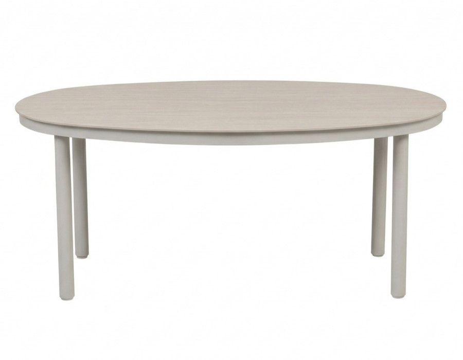 Dette havemøbelsæt består af et elegant havebord med bordplade i sintret sten og stel i grå/hvid aluminium samt 4 Nora havestole i sand. Den ovale bordform skaber et blødt og indbydende udtryk og giver god plads omkring bordet, mens den stenlignende overflade i sintret sten er både robust og velegnet til udendørs brug. Aluminiumsstellet bidrager med et...