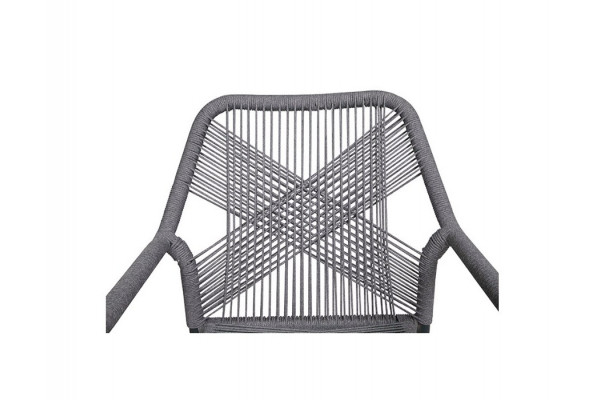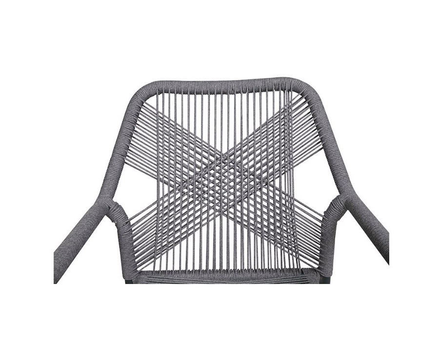 Sæde og ryg er fremstillet af robust polyester-reb, vævet af antracit-grå polyestertråde. Rebet er bundet i et smukt mønster omkring stellet.