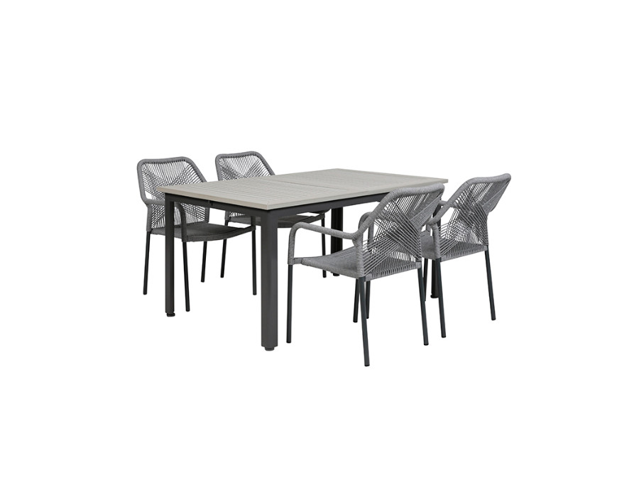 Flot og enkelt havemøbelsæt bestående af et stort udtræksbord og fire stabelstole.