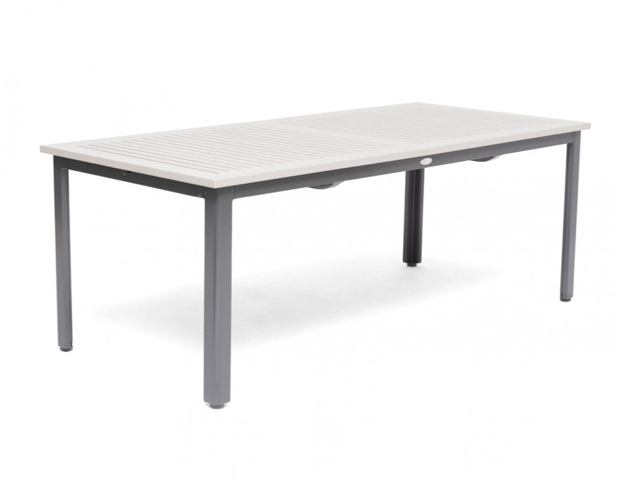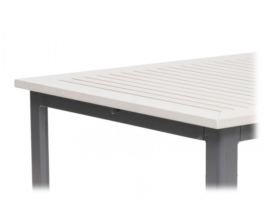 Bordet har et gråt aluminiumsstel og en flot lysegrå nonwood-bordplade, der giver et elegant udtryk. Det smarte udtrækssystem gør det nemt at forlænge bordet, hvor tillægspladen kan opbevares diskret under bordpladen.