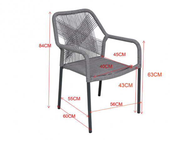 Sæde og ryg er fremstillet af robust polyester-reb, vævet af antracit-grå polyestertråde. Rebet er bundet i et smukt mønster omkring stellet.