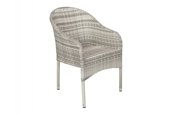 Stilren stabelstol med en robust stålramme og lys grå 2-line polyrattan flet, der giver et moderne og tidløst udtryk.