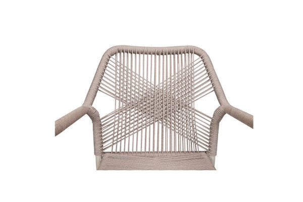 Sæde og ryg er fremstillet af robust polyester-reb, vævet af gråhvide polyestertråde. Rebet er bundet i et smukt mønster omkring stellet.