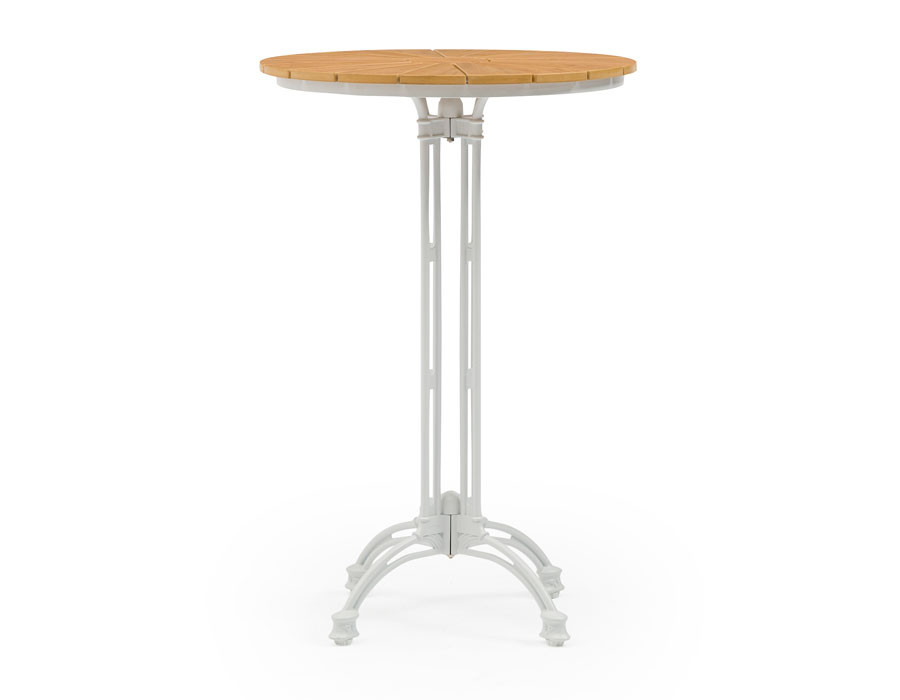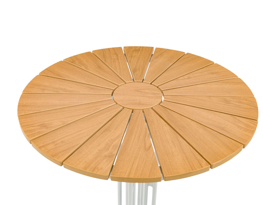 Rundt cafébord (Ø70 cm) med en bordplade i den nonwood, der giver et smukt trælook med høj holdbarhed. Stellet er fremstillet i hvid pulverlakeret aluminium