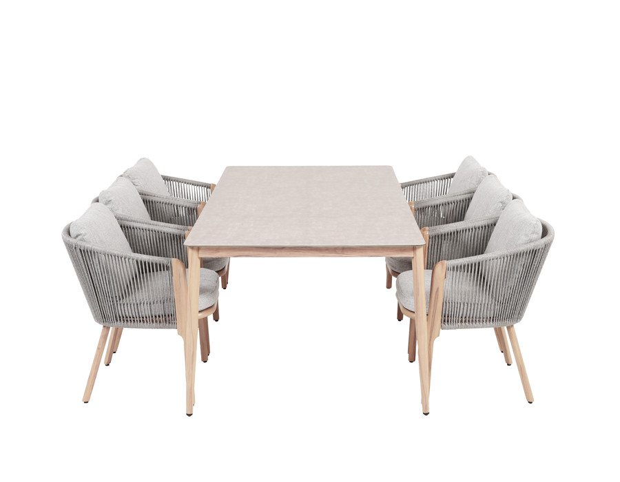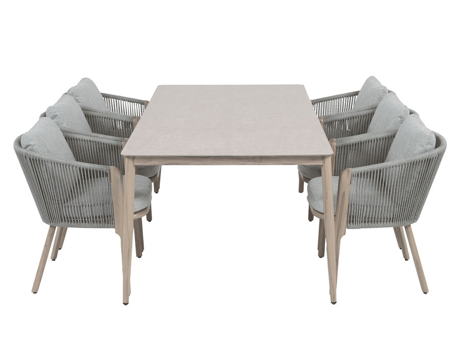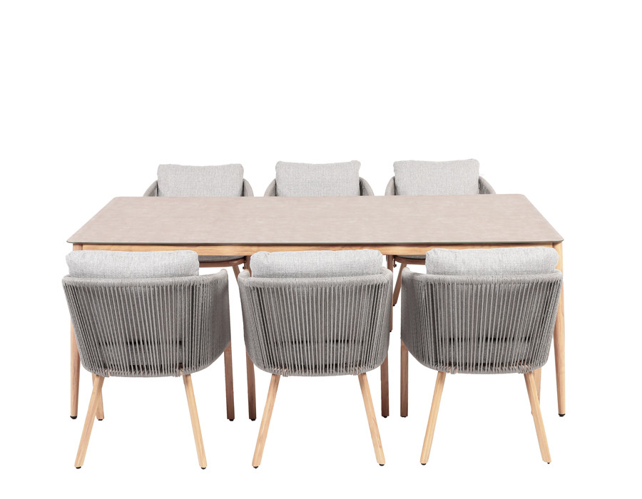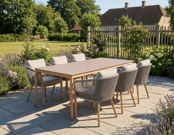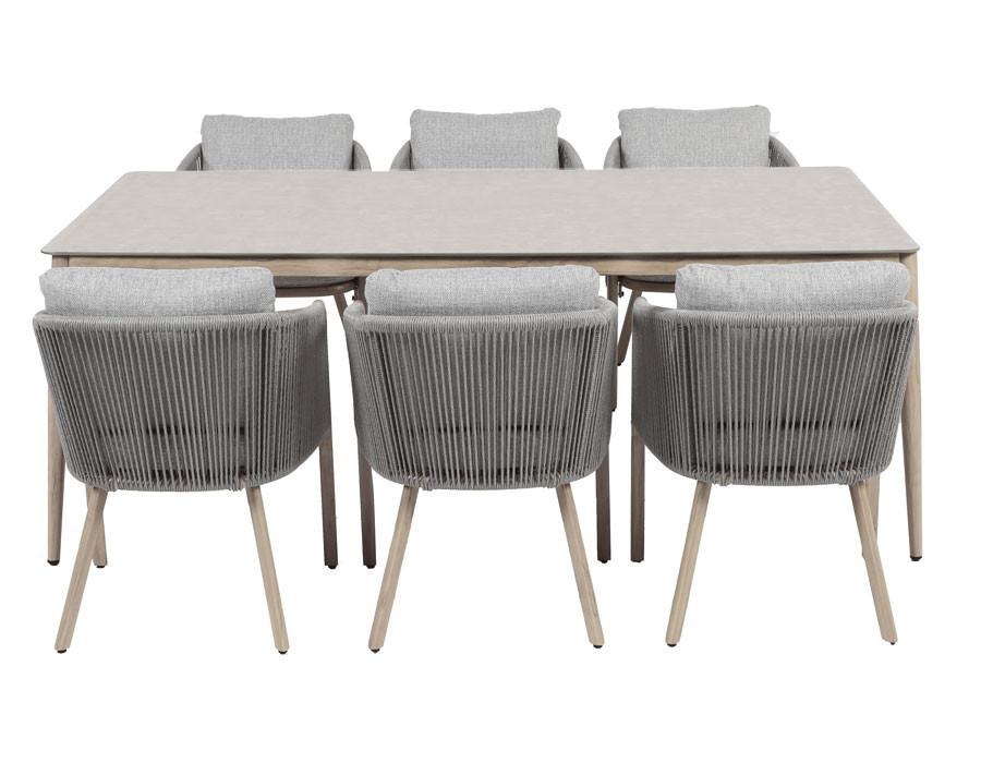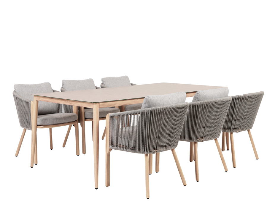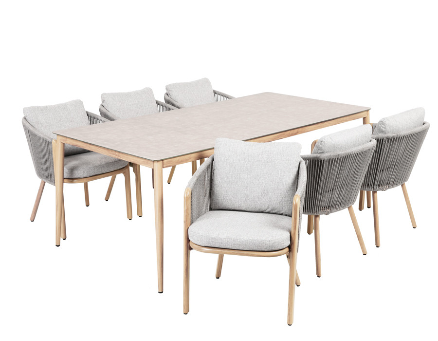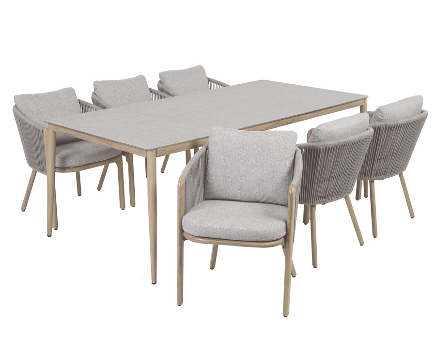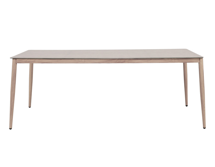 Stellet er i pulverlakeret aluminium med trælook. Bordet er let, stabilt og vejrbestandigt. Bordpladen i keramisk glas i beige nuancer, giver et elegant og moderne udtryk og har en slidstærk,...