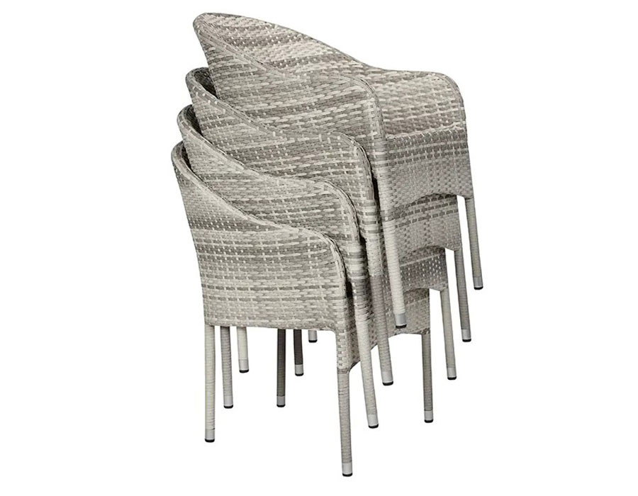 Stilren stabelstol med en robust stålramme og lys grå 2-line polyrattan flet, der giver et moderne og tidløst udtryk.