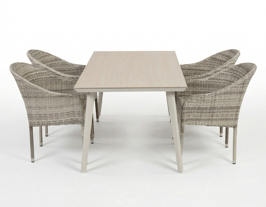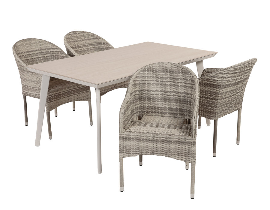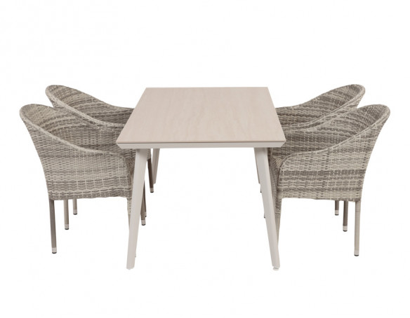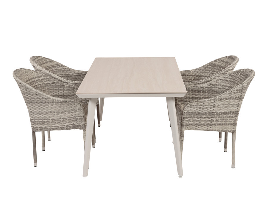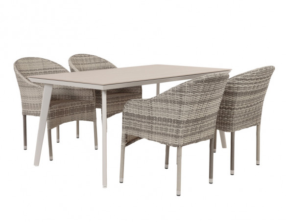 Dette havemøbelsæt består af Dagmar bordet i gråhvid og 4 Geneve stabelstole i grå polyrattan – et stilrent valg til terrasse og have. Bordet har stel i pulverlakeret aluminium og en slidstærk bordplade i sintret sten, som er skabt til udendørs brug og kræver minimal vedligeholdelse.