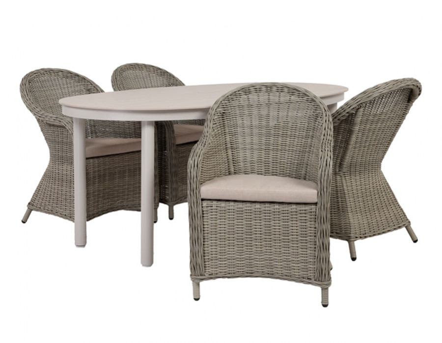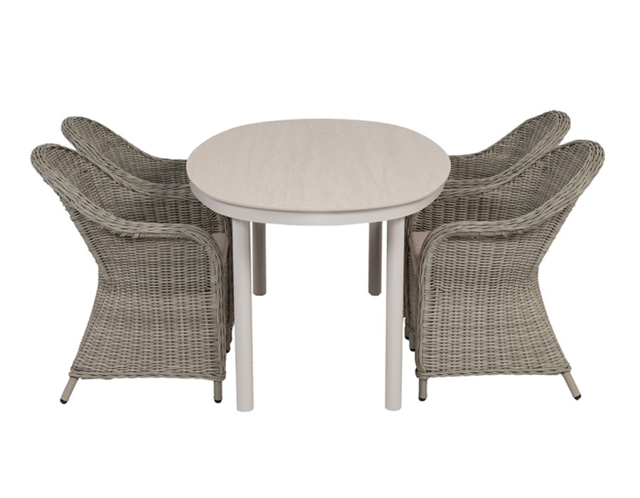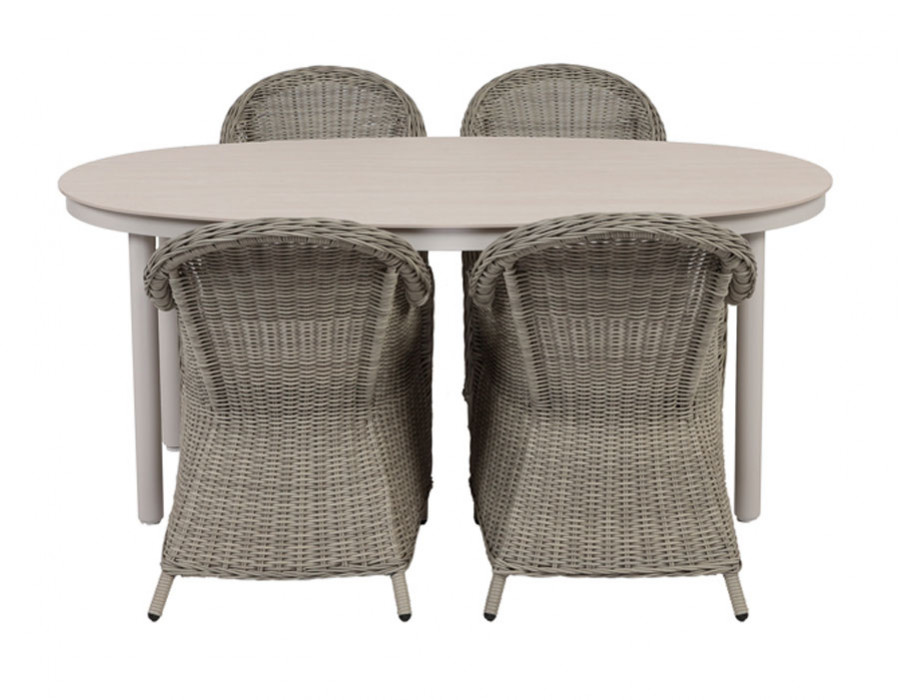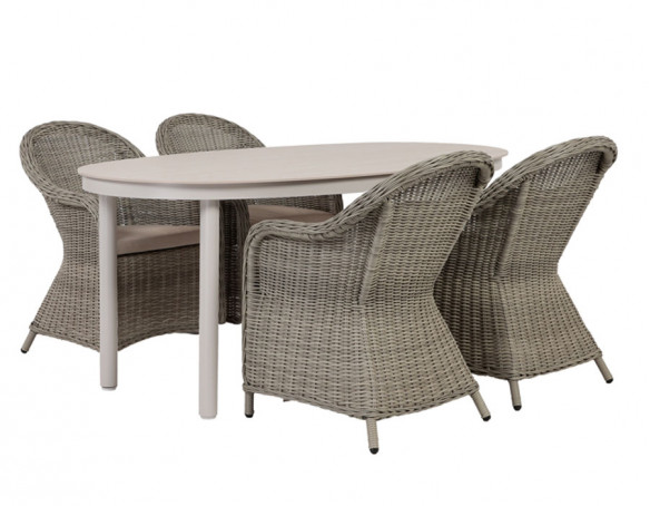 Dette havemøbelsæt kombinerer det ovale havebord med bordplade i sintret sten og stel i grå/hvid aluminium med 4 Andrea stabelstole i lys grå polyrattan. Bordets stenlignende overflade giver et eksklusivt udtryk og en robust løsning til udendørs brug, mens aluminiumsstellet holder designet let og moderne og kræver minimal vedligeholdelse.