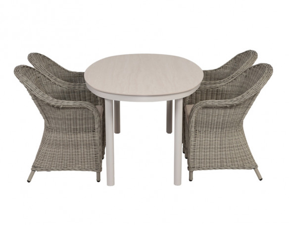 Dette havemøbelsæt består af et ovalt havebord med bordplade i sintret sten og stel i grå/hvid aluminium samt 4 Freja havestole i lys grå. Bordets stenlignende overflade giver et eksklusivt look og er robust til udendørs brug, mens aluminiumsstellet holder udtrykket let og kræver minimal vedligeholdelse. Den ovale form skaber en blød helhed og giver god...