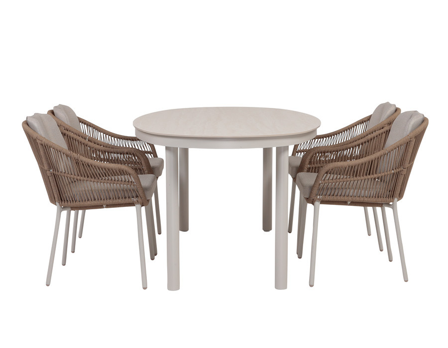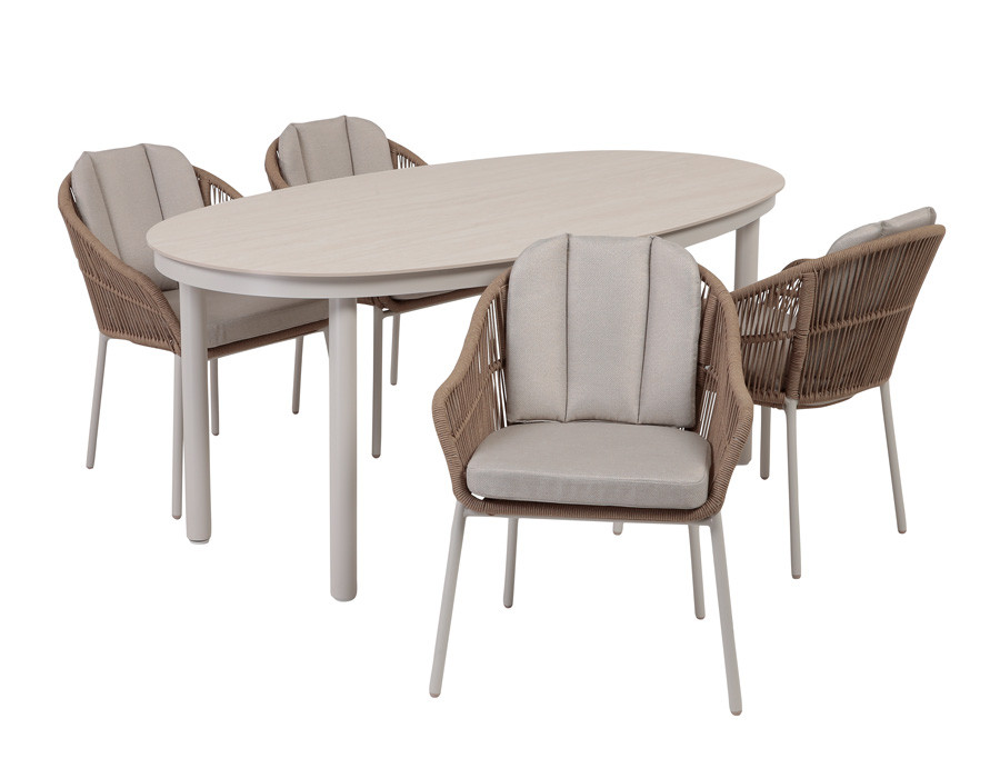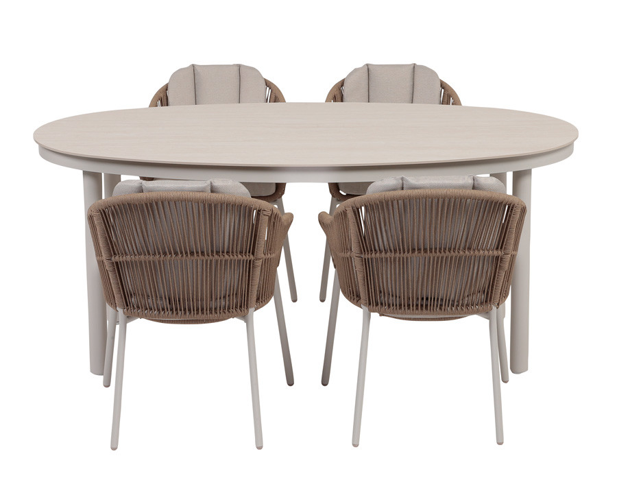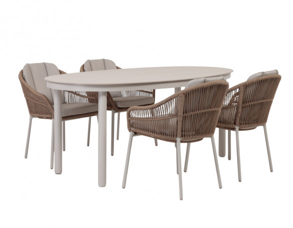 Dette havemøbelsæt består af et elegant havebord med bordplade i sintret sten og stel i grå/hvid aluminium samt 4 Nora havestole i sand. Den ovale bordform skaber et blødt og indbydende udtryk og giver god plads omkring bordet, mens den stenlignende overflade i sintret sten er både robust og velegnet til udendørs brug. Aluminiumsstellet bidrager med et...
