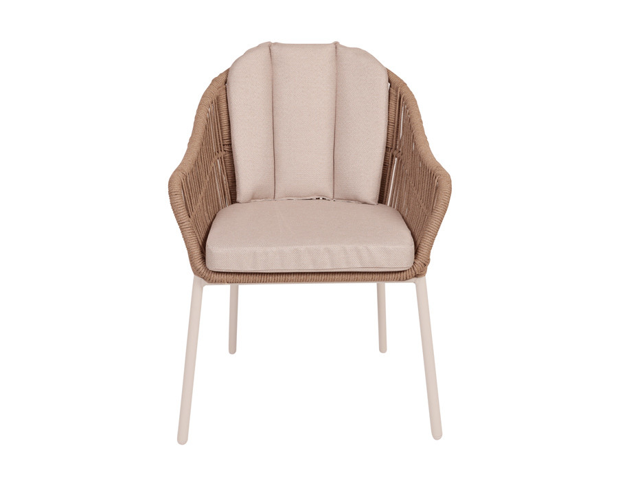 Superflot og stilregn stabelstol med et stel lavet af aluminium. Ryglænet og sædet er konstrueret af flettet reb i 100% beige polyester, hvilket giver et let og elegant udtryk.