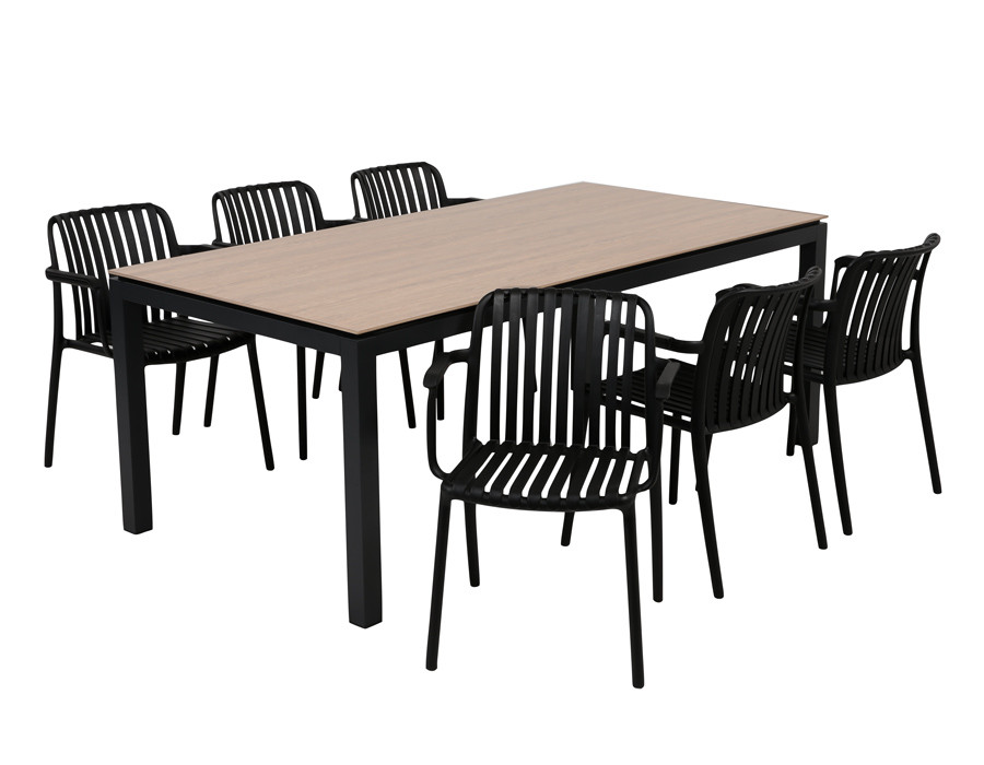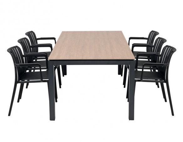 Skab en elegant og indbydende spiseplads udendørs med dette havesæt bestående af Selma bord og 6 Nora havestole. Sættet kombinerer et moderne udtryk med slidstærke materialer og god komfort, perfekt til hyggelige middage og lange sommeraftener på terrassen.