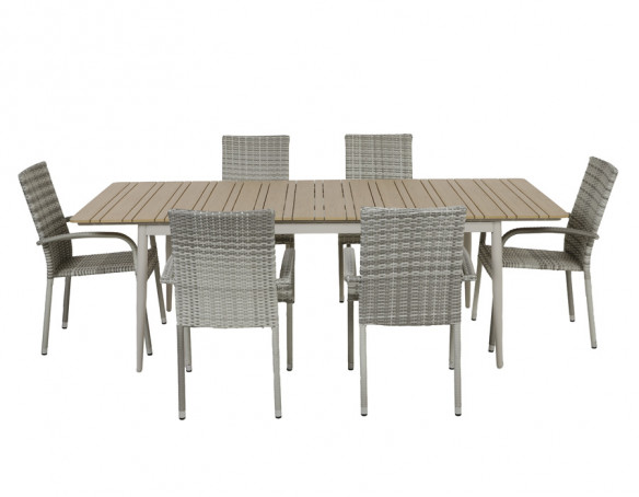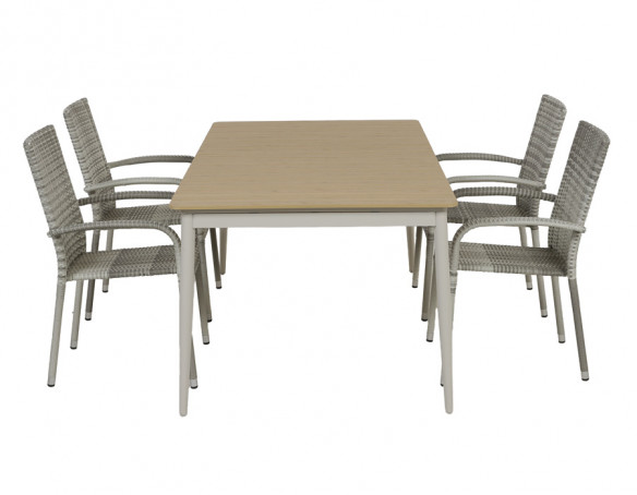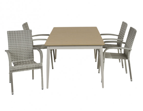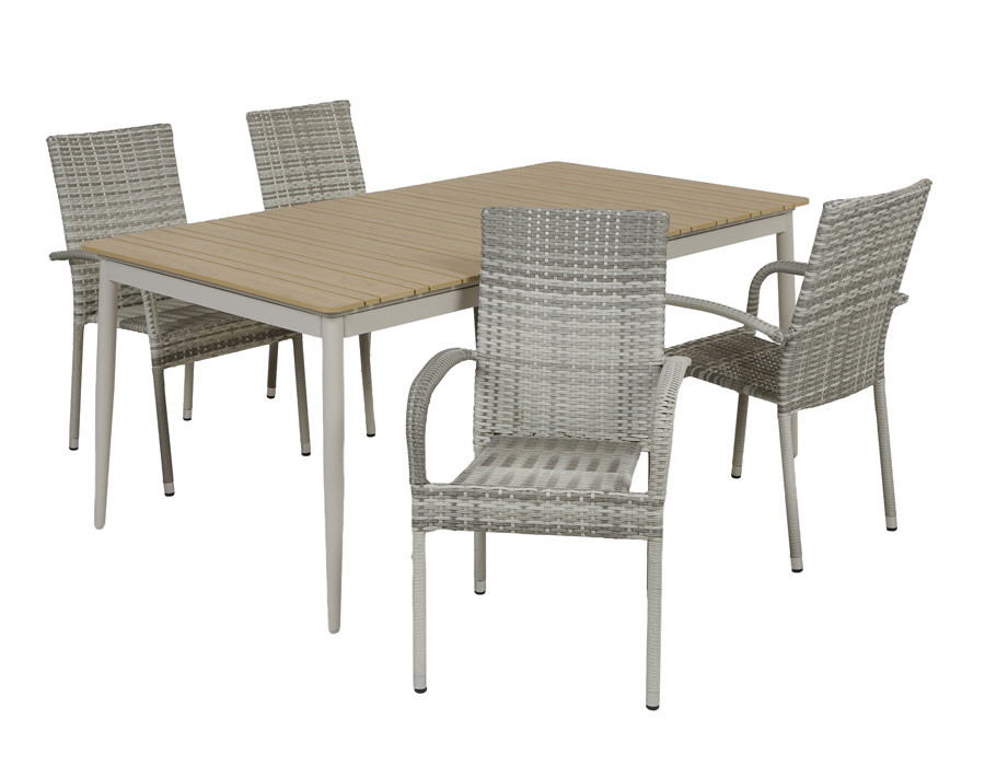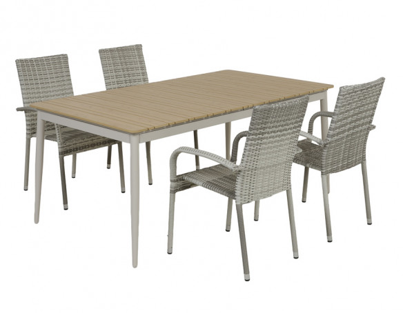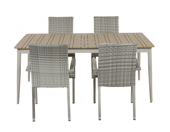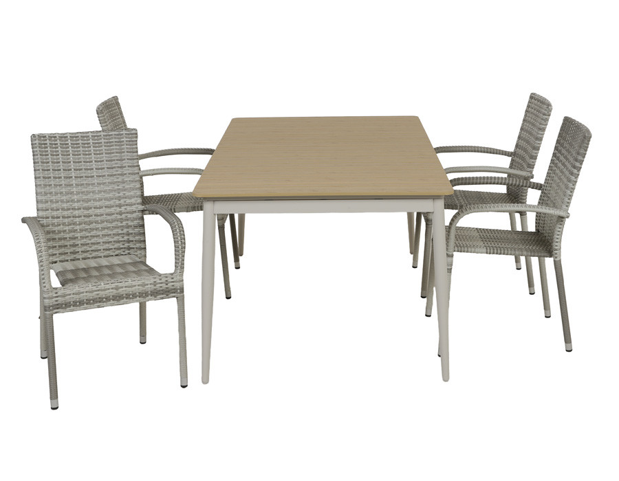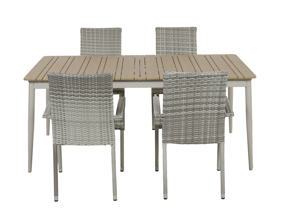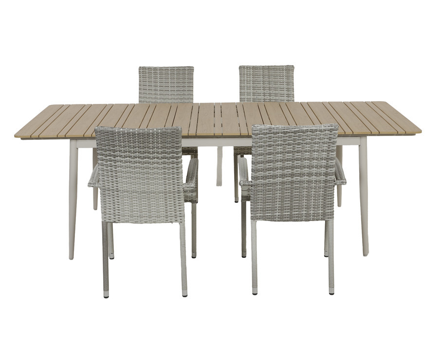 Dette havemøbelsæt kombinerer Malmø udtræksbordet i grå/hvid med 4 Geneve stabelstole og giver en stilren løsning til både hverdag og gæster. Bordet har vejrbestandigt stel i pulverlakeret aluminium og en bordplade i nonwood/polywood i naturlig træfarve, som tilfører varme og kræver minimal vedligeholdelse. Med udtræk kan bordet forlænges fra 180 til 235 cm, og justerbare fødder sørger for stabilitet på ujævne fliser.