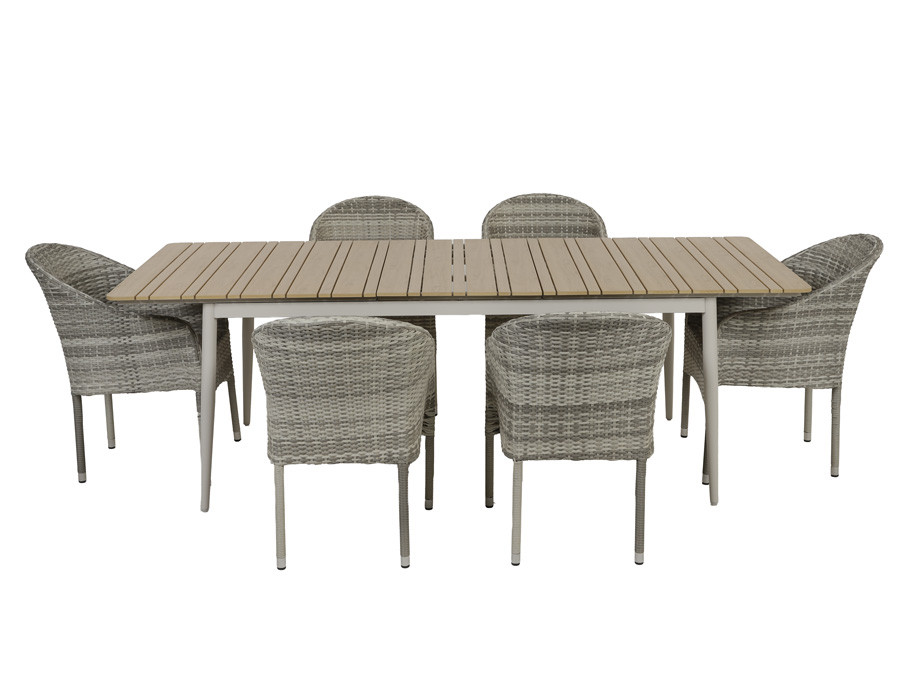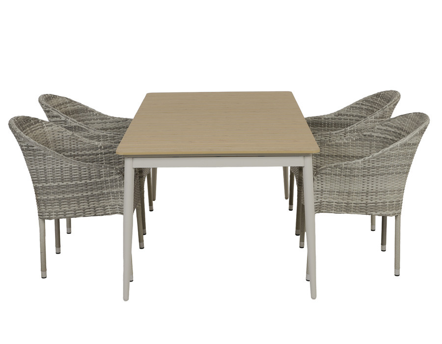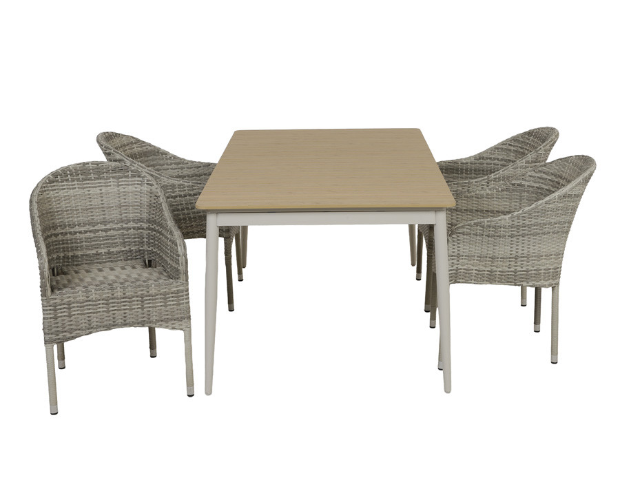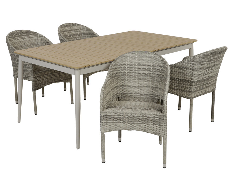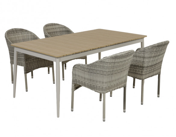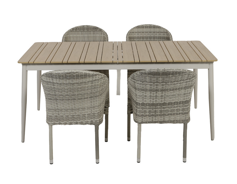 Dette havemøbelsæt kombinerer Malmø udtræksbordet i grå/hvid med 4 elegante stabelstole i beige rebflet og giver et lyst, moderne udtryk til terrasse og have. Bordet har et vejrbestandigt stel i pulverlakeret aluminium og en bordplade i nonwood/polywood i naturlig træfarve, som tilfører varme og kræver minimal vedligeholdelse. Bordet kan forlænges fra 180...