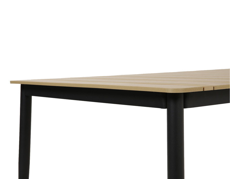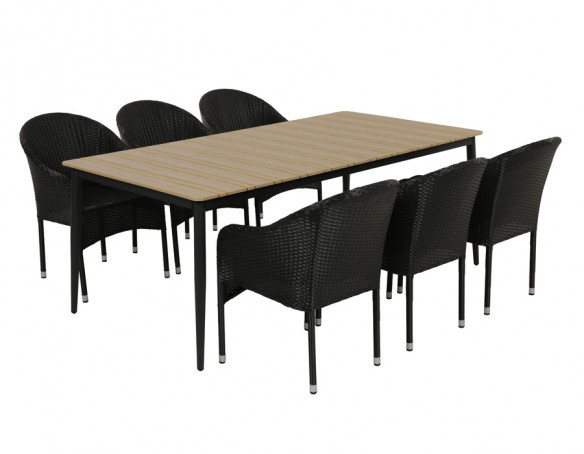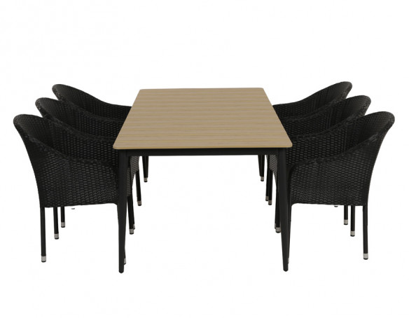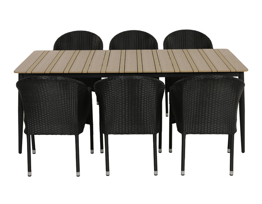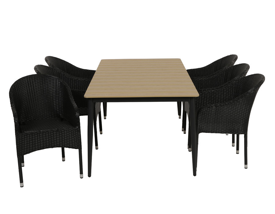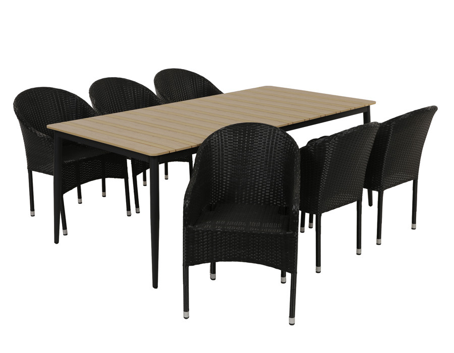 Dette havesæt består af Malmø havebordet og 6 elegante havestole, som tilsammen skaber en stilren og indbydende spiseplads til terrassen eller haven. Bordet har et solidt aluminiumsstel i mørkegrå pulverlakering og en bordplade i nonwood/polywood i naturlig træfarve, som giver en flot kontrast og kræver minimal vedligeholdelse. Med en længde på 200 cm er der god plads til 3 stole på hver side.