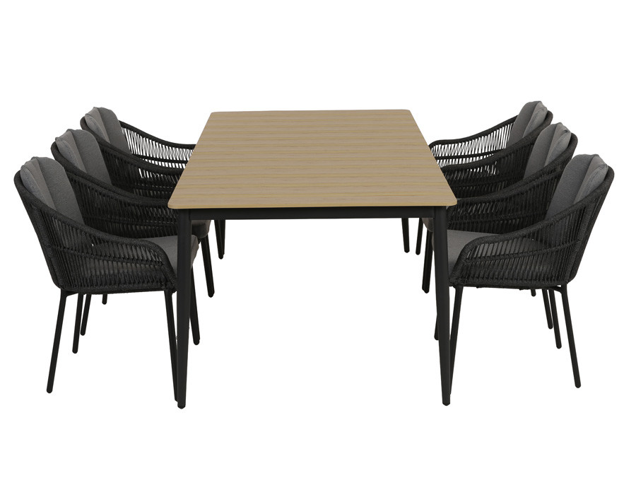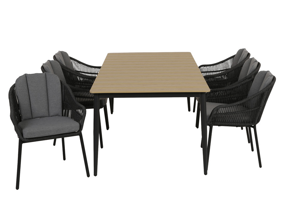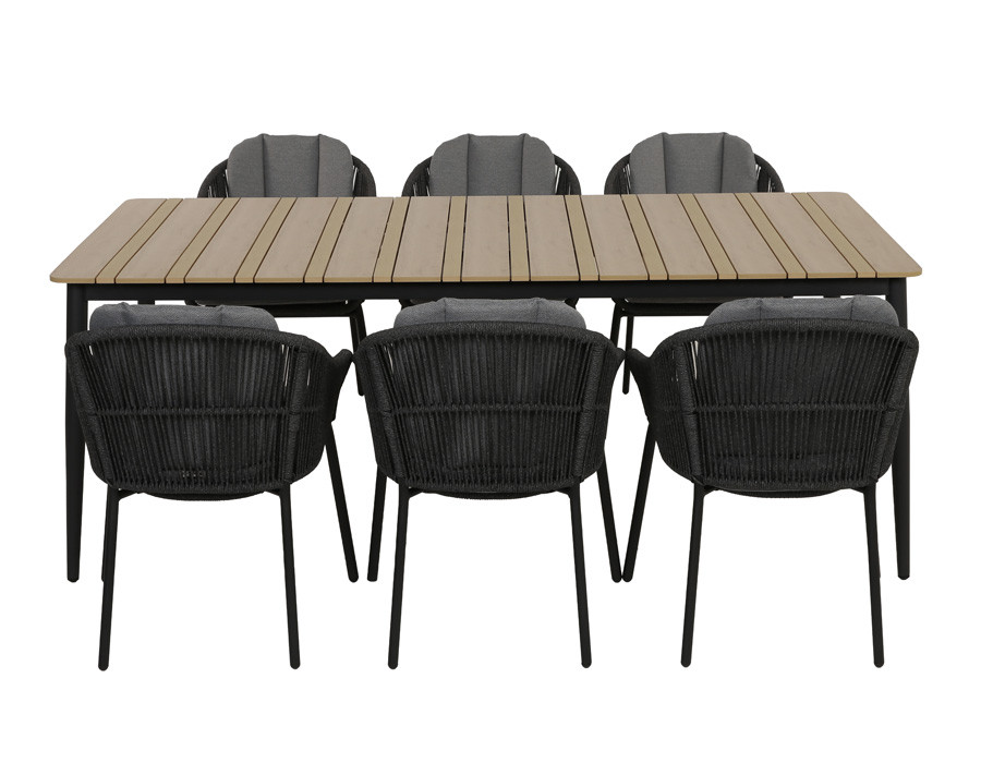 Malmø havesæt består af 1 udtræksbord og 4 havestole i et stilrent design, der passer perfekt til terrassen og uderummet. Bordet har et solidt aluminiumsstel med mørkegrå pulverlakering og en bordplade i nonwood/polywood i naturlig træfarve, som giver et varmt udtryk og kræver minimal vedligeholdelse.
