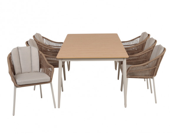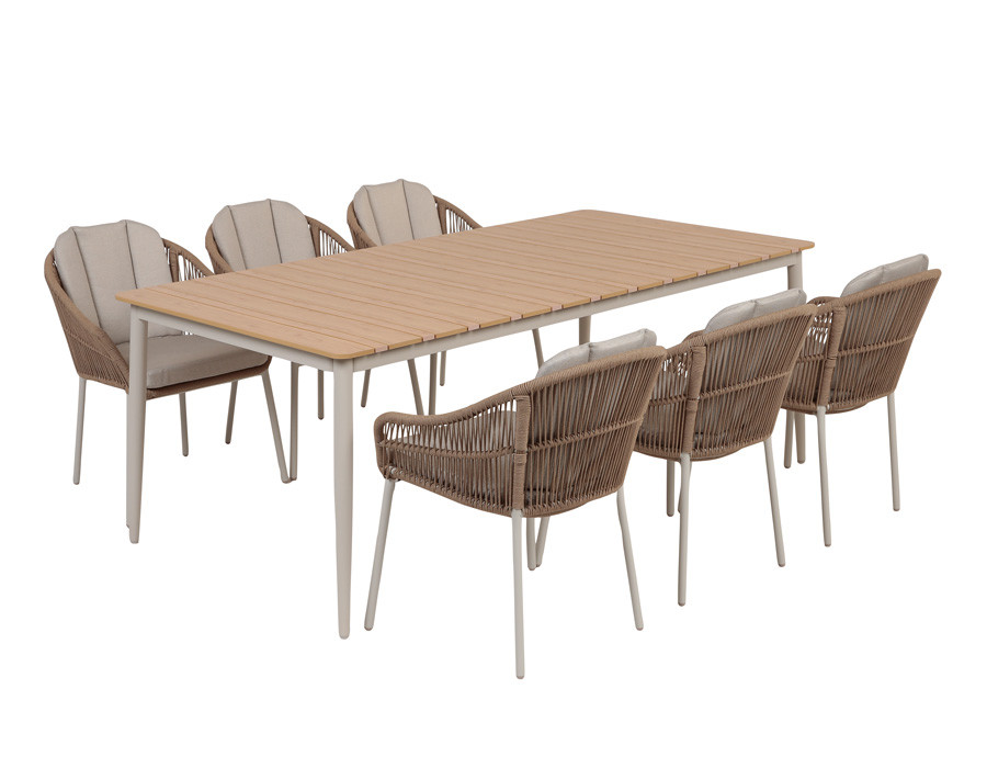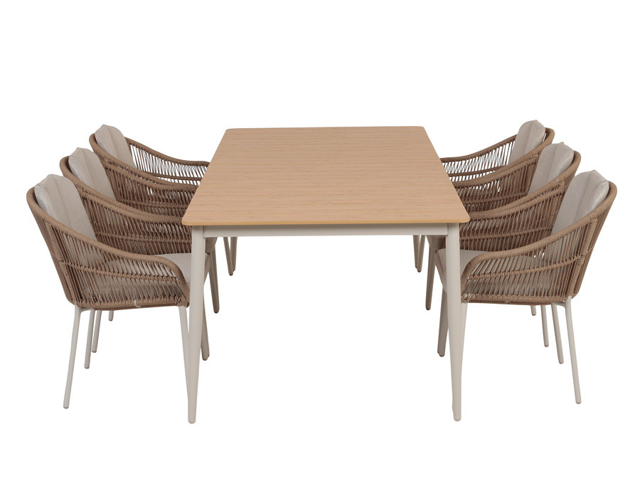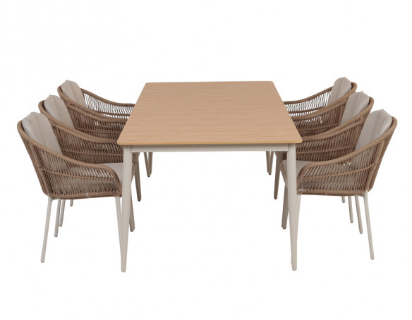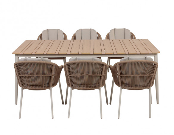 Superflot og stilregn stabelstol med et stel lavet af aluminium. Ryglænet og sædet er konstrueret af flettet reb i 100% beige polyester, hvilket giver et let og elegant udtryk.