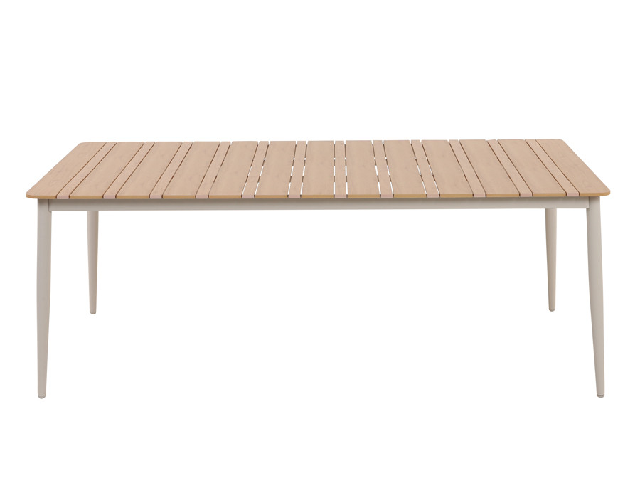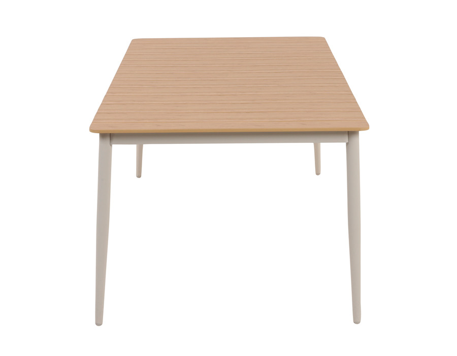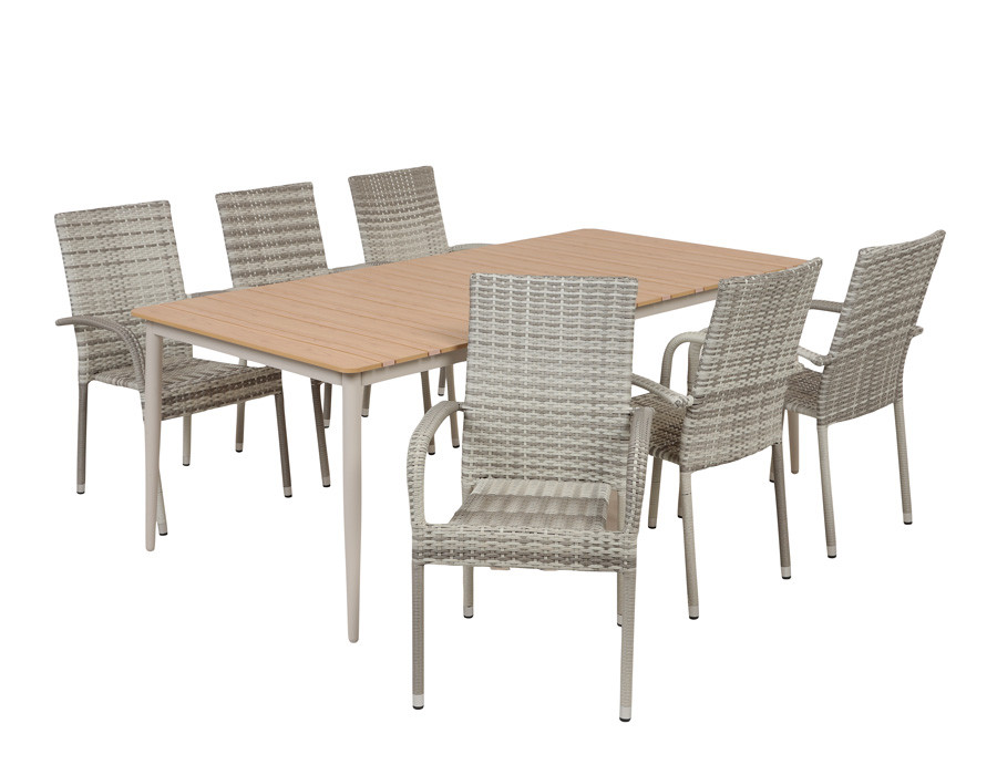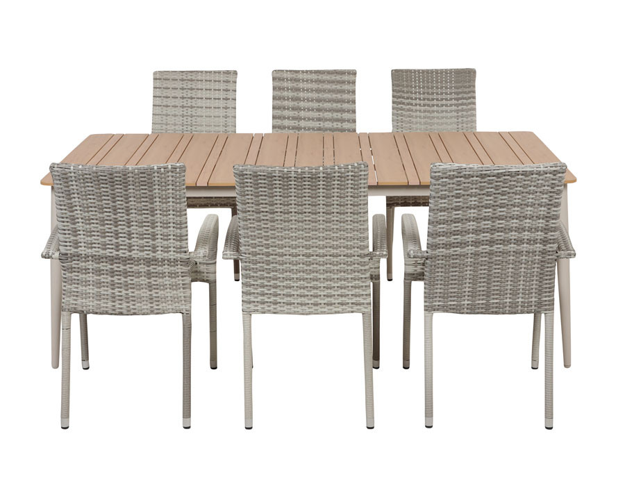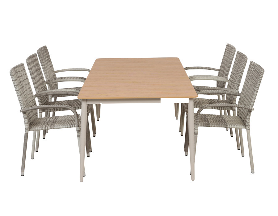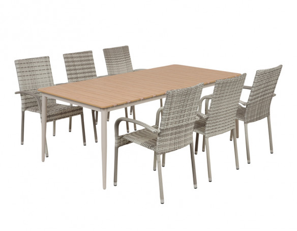 Dette havesæt består af Malmø havebordet og 6 enkle stabelstole, der tilsammen skaber en praktisk og stilren spiseplads til terrassen eller haven. Bordet har et solidt aluminiumsstel med mørkegrå pulverlakering og en bordplade i nonwood/polywood i naturlig træfarve, som giver et varmt udtryk og kræver minimal vedligeholdelse. Med en længde på 200 cm er der god plads til 3 stole på hver side. De 6 stabelstole har stålstel og 2-line grå polyrattan flet, som giver et enkelt og tidløst look. Stolene er 100% vedligeholdelsesfri og kan stables, når de ikke er i brug.