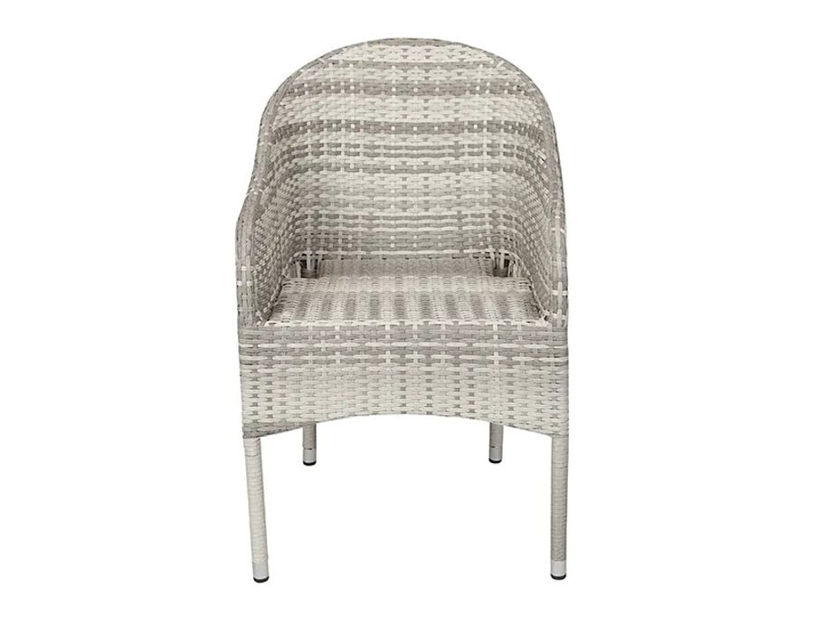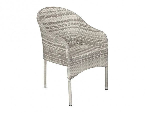 Stilren stabelstol med en robust stålramme og lys grå 2-line polyrattan flet, der giver et moderne og tidløst udtryk.