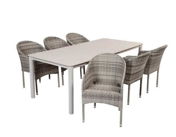 Gør terrassen klar til både hverdag og gæster med dette elegante sæt, hvor bordet med gråhvidt aluminiumsstel matches med Freja havestole i lys grå. Bordets bordplade i sintret sten giver en flot, stenlignende finish og er fremstillet af naturmaterialer, der er presset og brændt ved meget høj varme.