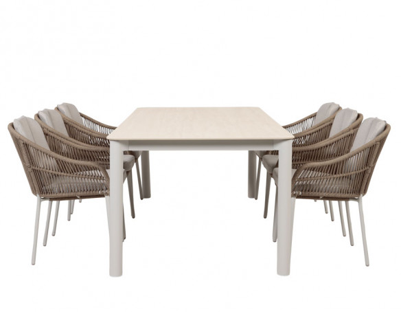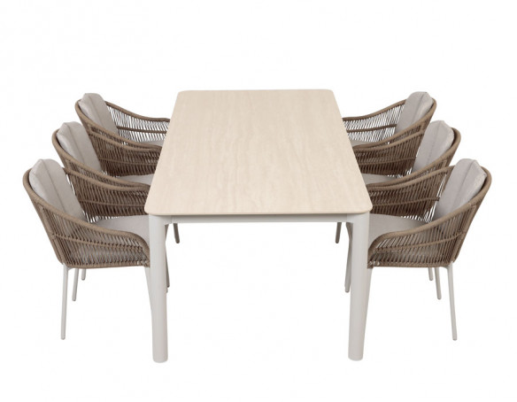 Dette havemøbelsæt skaber et roligt, eksklusivt udtryk på terrassen og kombinerer det elegante havebord med 6 stilrene stabelstole i lys grå polyrattan. Bordet har et slankt stel i gråhvid aluminium, der giver et let og moderne look, mens bordpladen i sintret sten fuldender helheden med en flot, stenlignende overflade.