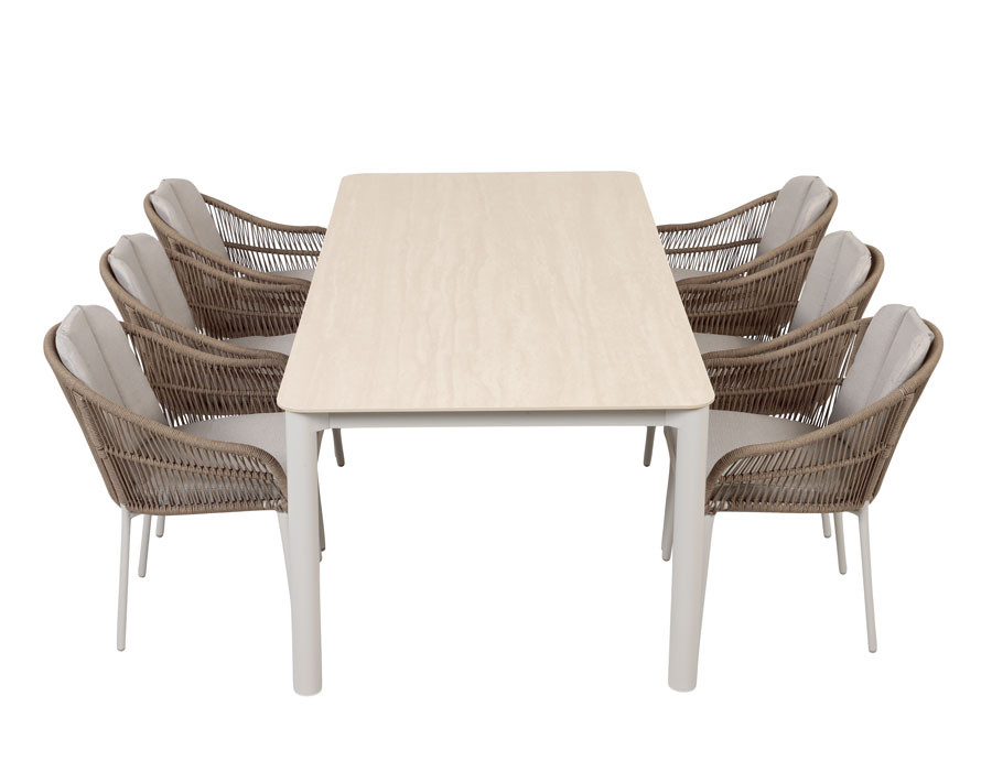 Gør terrassen klar til både hverdag og gæster med dette elegante sæt, hvor bordet med gråhvidt aluminiumsstel matches med Freja havestole i lys grå. Bordets bordplade i sintret sten giver en flot, stenlignende finish og er fremstillet af naturmaterialer, der er presset og brændt ved meget høj varme.