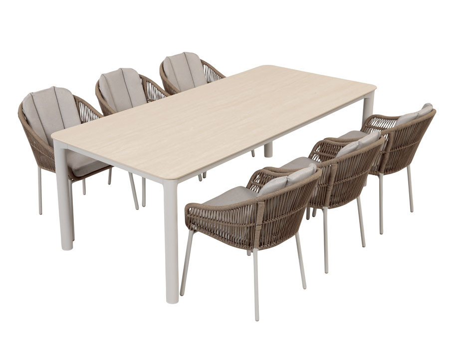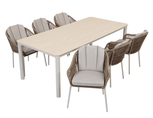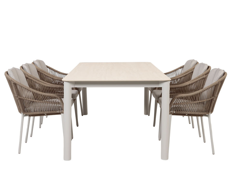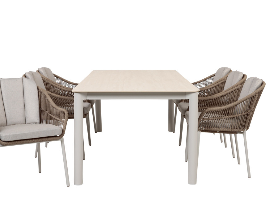 Skab et roligt og elegant udemiljø med dette sæt, hvor det stilrene bord med gråhvidt aluminiumsstel kombineres med Nora havestole i sand. Bordet har en bordplade i sintret sten med en flot, stenlignende overflade, fremstillet af naturmaterialer presset og brændt ved meget høj varme – et stærkt valg til udelivet, der holder sig pænt sæson efter sæson....
