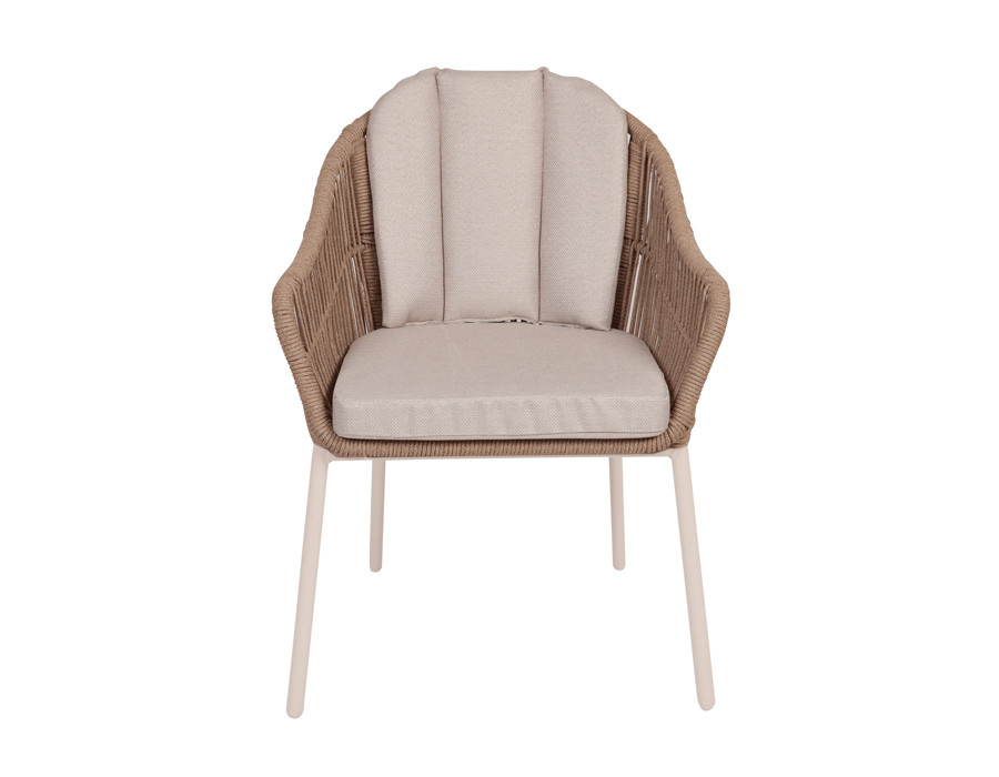 Superflot og stilregn stabelstol med et stel lavet af aluminium. Ryglænet og sædet er konstrueret af flettet reb i 100% beige polyester, hvilket giver et let og elegant udtryk.