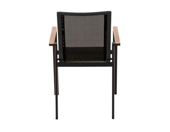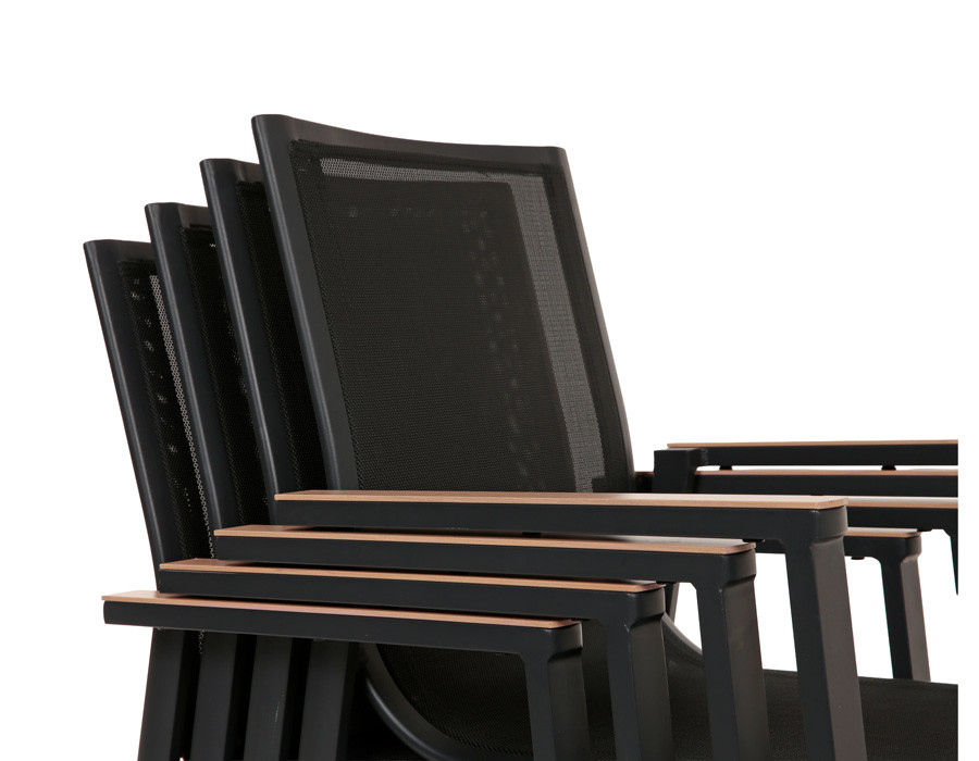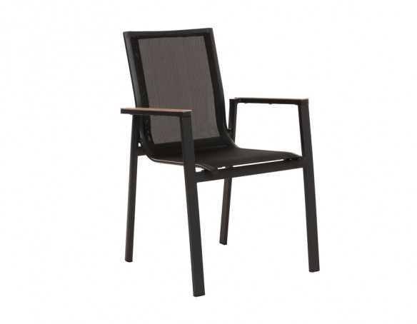 Stolene er fremstillet i aluminium med sæde og ryglæn i textiline, som giver god siddekomfort, let fleksibilitet og minimal vedligeholdelse. Armlæn i trælook tilfører varme til det enkle design, og stolene kan stables, når de ikke...