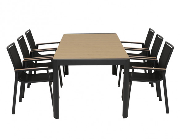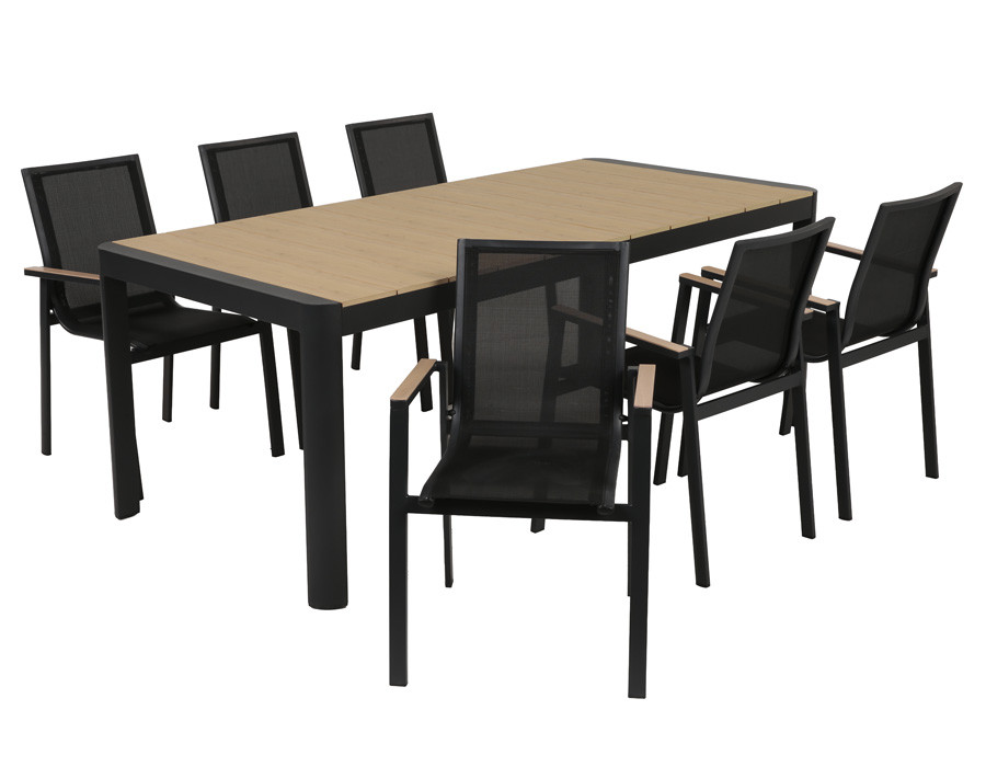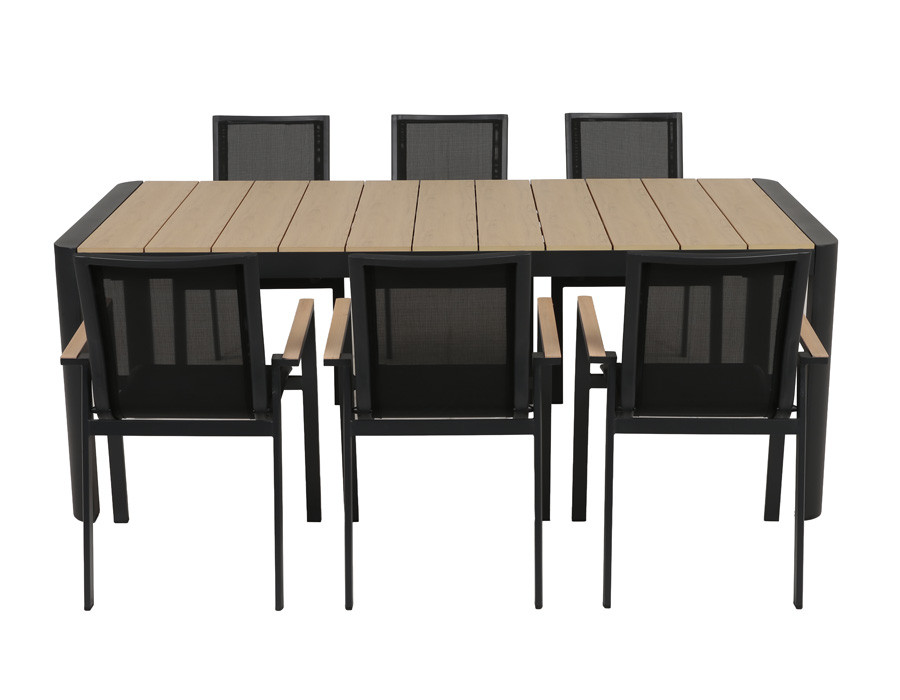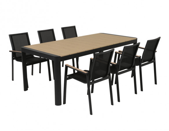 Dette udtrækshavebord kombinerer et stilrent, moderne design med praktisk fleksibilitet til uderummet. Bordet har et robust stel i mørkegrå aluminium, der giver et roligt og eksklusivt udtryk, mens bordpladen i nonwood tilfører varme og gør bordet nemt at matche med både lyse og mørke havestole.