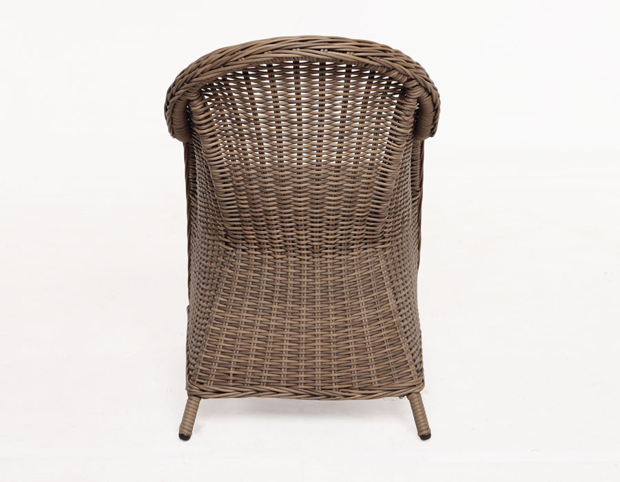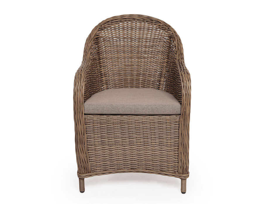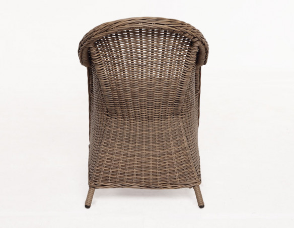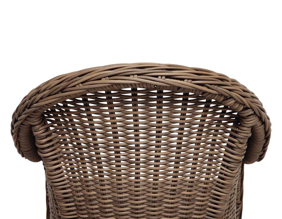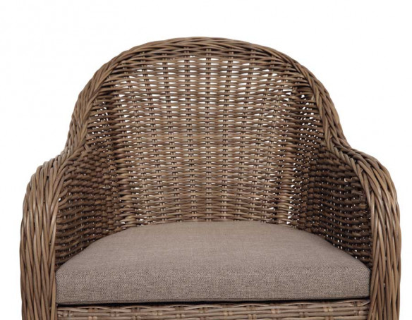 Enkelt cafébord med stel i kraftig dusty polyrattan-flet samt bordplade i flotte lameller i nonwood.