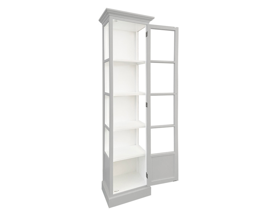 Elegant vitrineskab fremstillet i malet massivt træ. Skabet er hvidmalet indvendigt.